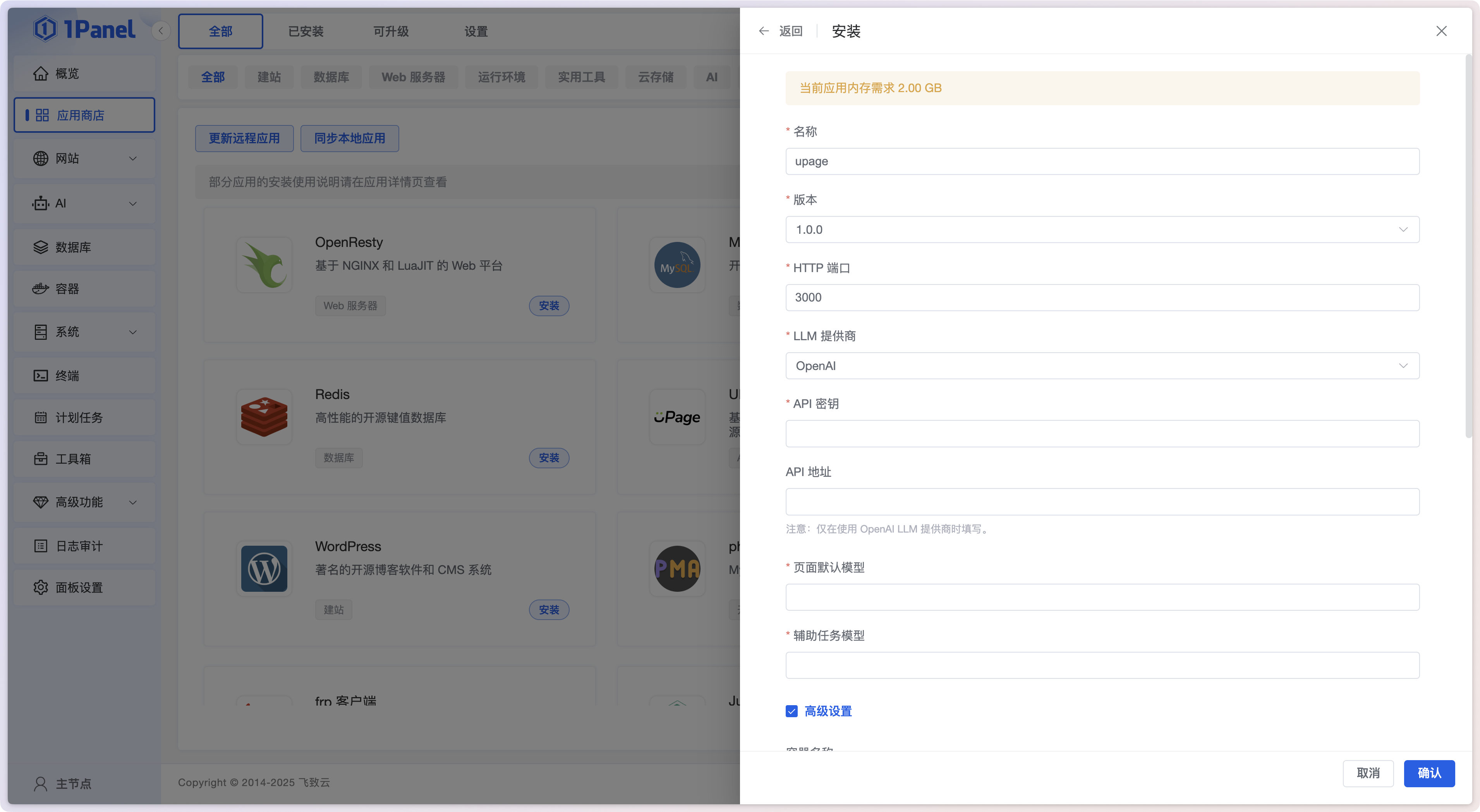| 版本 | 要安装的 UPage 版本,选择最新即可 | 1.0.0 |