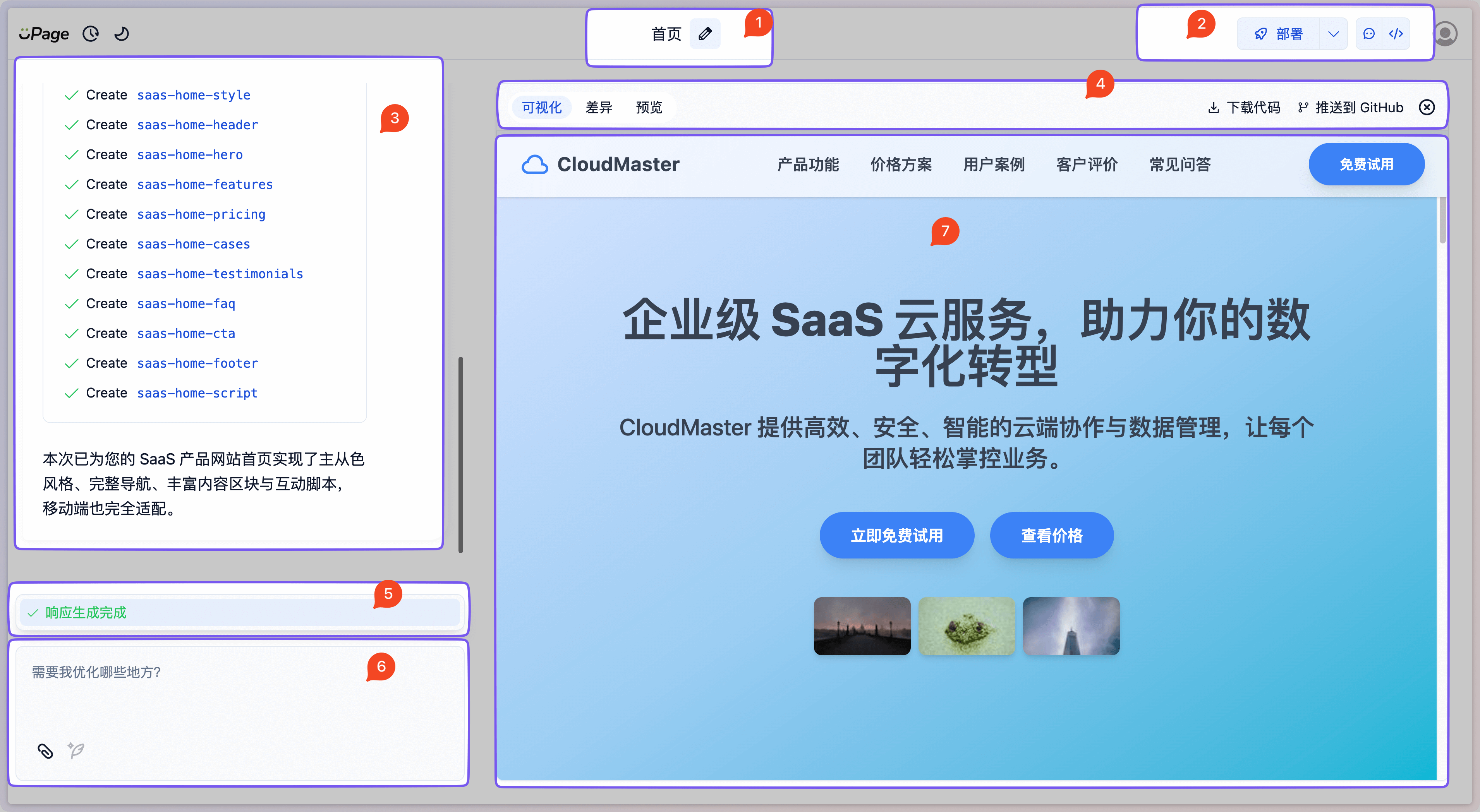 - 对话输入框::用户与 AI 可以进行多轮对话,对生成的页面进行多轮调整。