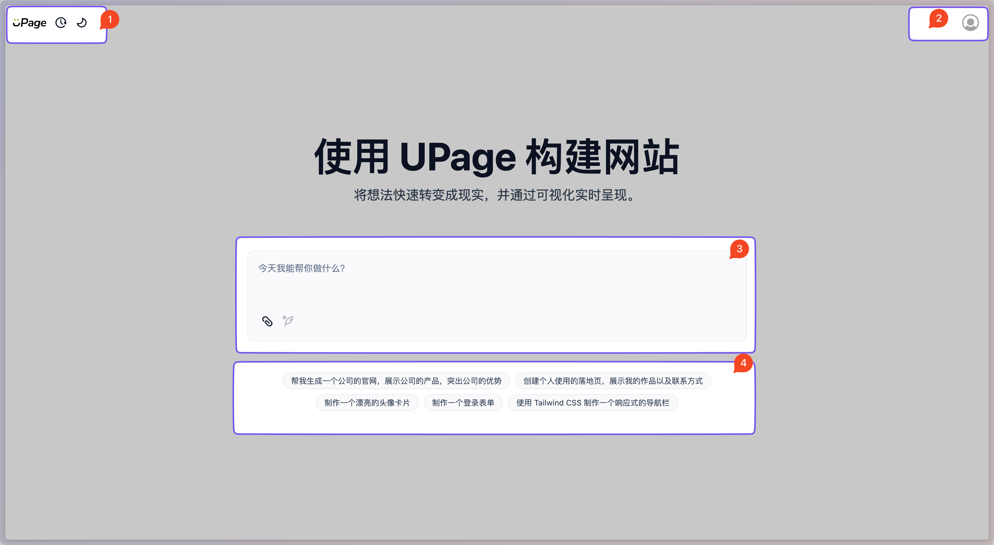 - 主功能区域: UPage 的主要入口,包括 聊天输入框、上传按钮、提示词优化 等功能。