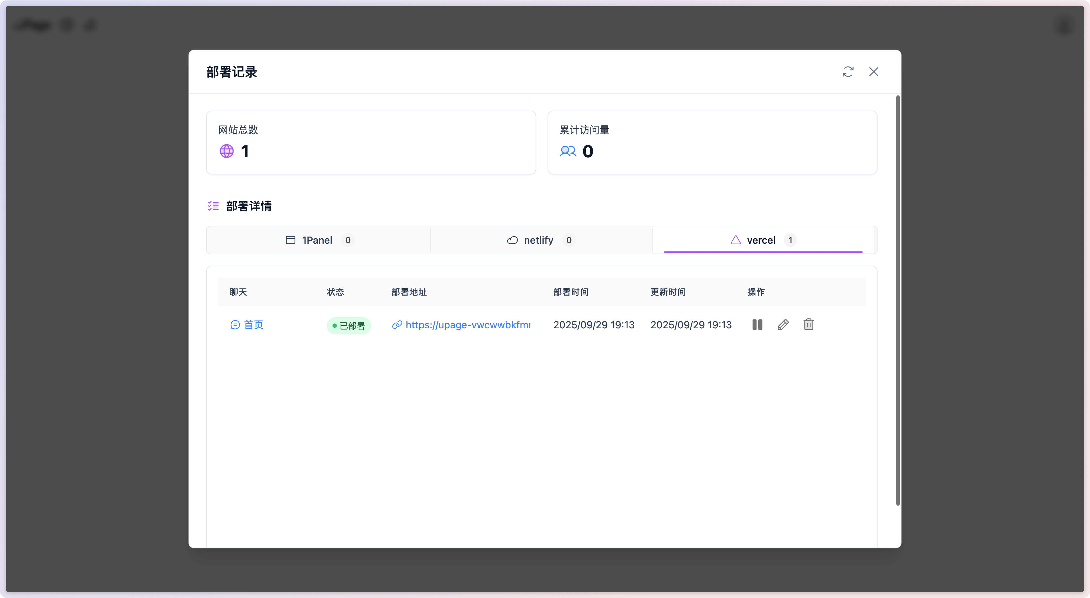 点击部署记录按钮,可以查看当前聊天的部署记录。