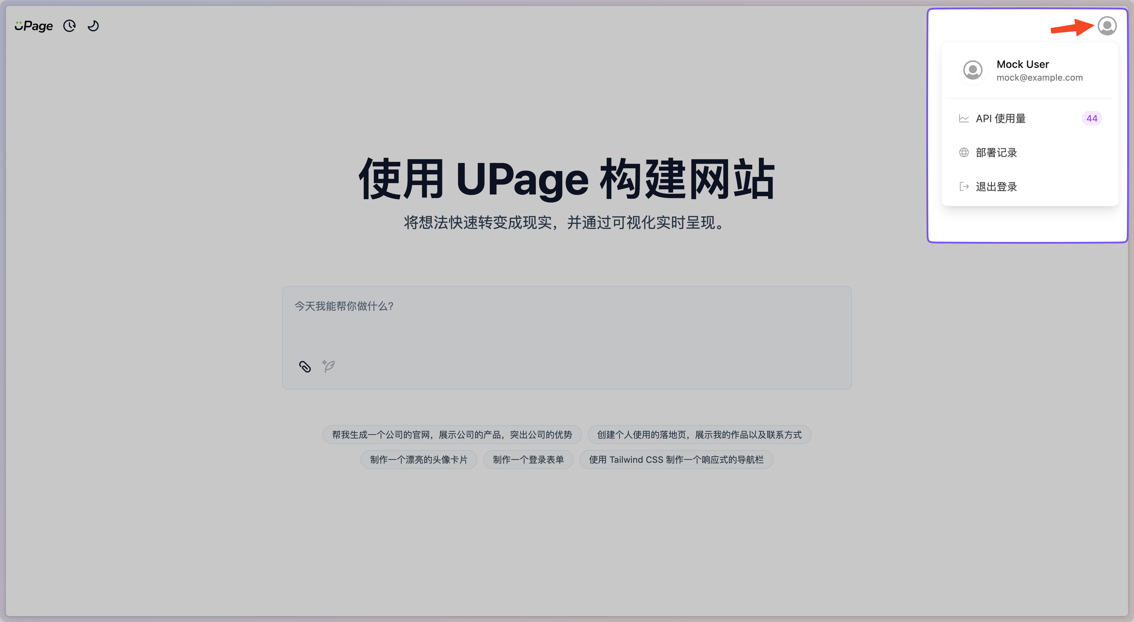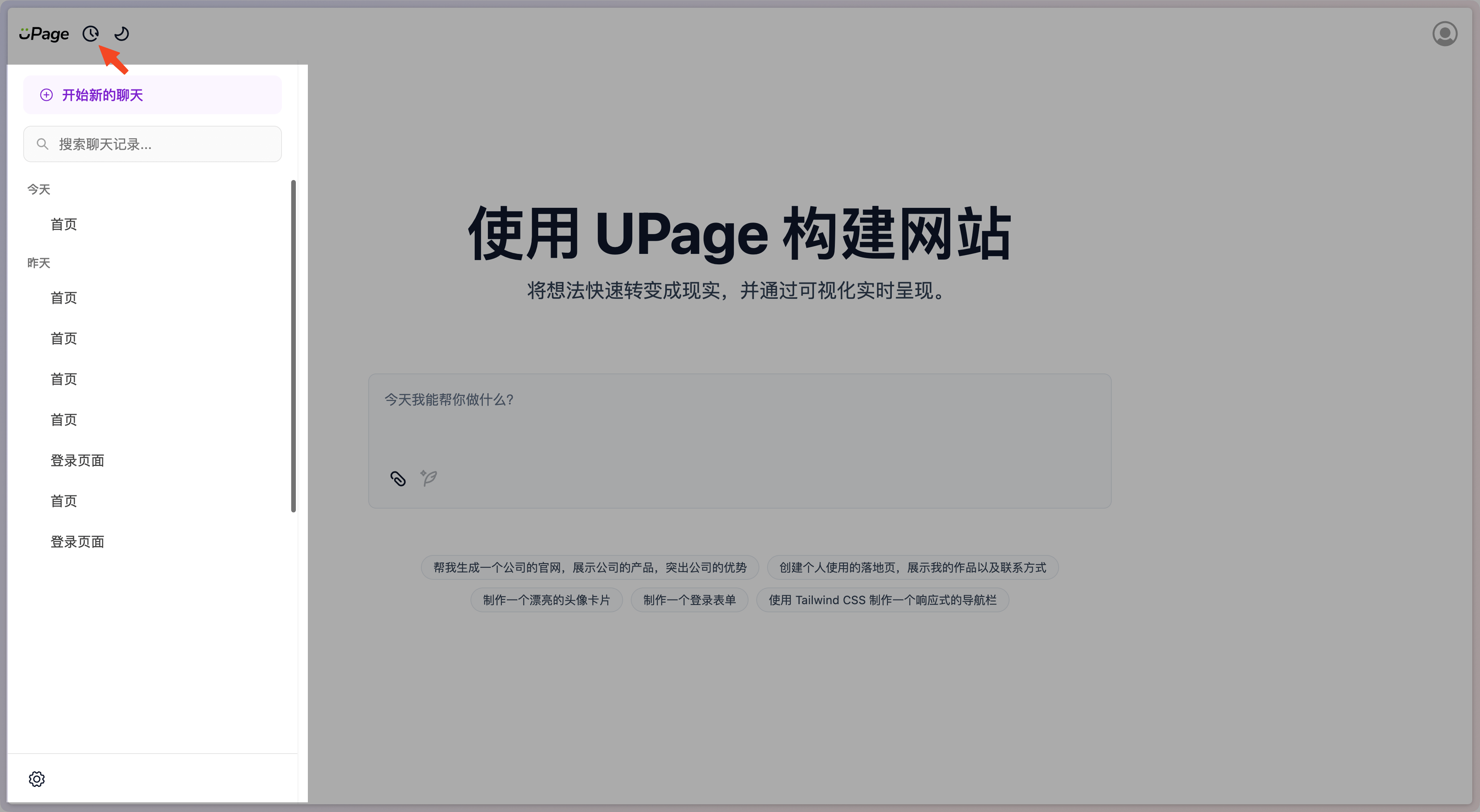 首页是 UPage 的入口,用户可以在此页面中对将要生成的页面进行首次提示词的填写。